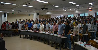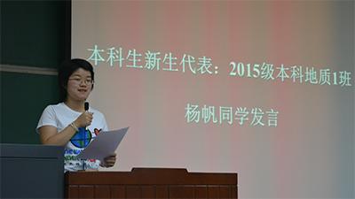 2015年新生开学典礼于理教107室举行。中国科学院院士叶大年,院长张立飞,院党委书记傅绥燕,院党委副书记于超美,各研究所所长,学院行政系统各老师以及新生班主任代表出席了典礼。典礼由2014级本科生黄如许主持。