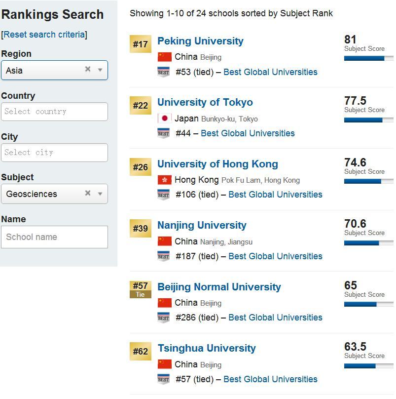 在地球科学(Geosciences)门类中仍名列全球第17位,与去年相比又有提升,超过了东京大学,真正意义上的位居亚洲地区大学首位。得分(81分)也相较于去年的79.7分略有增加。