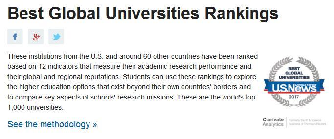 2016年10月25日,《美国新闻与世界报道》(US News)公布了2017年度最新世界大学排名。这是一直以全美大学排名为金字招牌的US News发布的第三次世界大学排名,本次大学排名致力于让人们了解各个国家顶尖学府在全球范围中的定位,尤其是特别关注学校的整体学术研究和业界名誉。