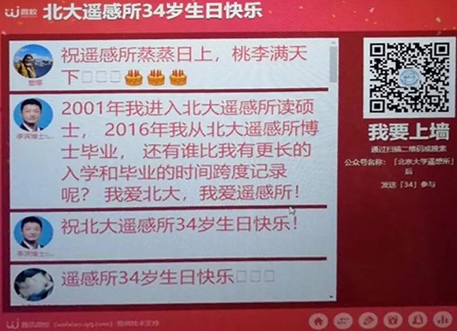 为了庆祝建所34周年这个特别的日子,本次活动还增设了“校友上墙”环节,数百名校友通过微信在线参与了本次庆祝活动,“拳拳爱所心”,校友们穿越时空,在墙上表达了对遥感所的真挚祝福。