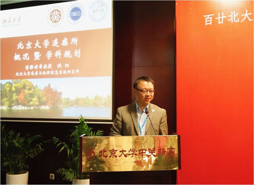 讲席教授洪阳所长代表遥感所致欢迎辞。洪阳教授回顾了遥感所的发展历史,详细介绍了遥感所主要研究方向与代表性科研成果,并展望 了北大遥感所面向“定量遥感、时空智能”特色目标的中长期的发展规划。洪阳教授还重点介绍了遥感所双一流学科建设的目标,并诚邀国内外优秀青年学者加入北 大遥感地信青年科学家团队,共同推动我国遥感地信事业的发展。