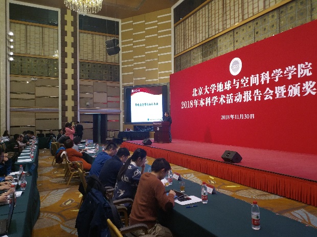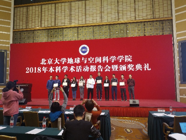 同时,现场还对过去一年中在本科生科研、野外实习等学术活动中取得优异成果的同学们进行了表彰。张波老师宣读了“颁发2018年本科生科研训练优秀项目奖的决定”,并为获奖同学颁奖。张老师表示,自己十分高兴能看到有很多同学在本科阶段就能参与到科研项目中。他认为这些同学通过本科生科研拓宽了自己的知识范围,培养了自己的动手、创新和科研能力,为自己未来的科研道路提供了良好的开端。田原老师则宣读了“颁发2018年本科生优秀实习报告奖的决定”,并与薛进庄老师为获奖同学颁奖。田老师提到野外实习是学院重要而且最有特色的教学项目,也同时说明了该奖项的设立旨在促进同学们夯实基础、结合理论与实践、建立正确的地学思维并树立正确的人生观和苦乐观。