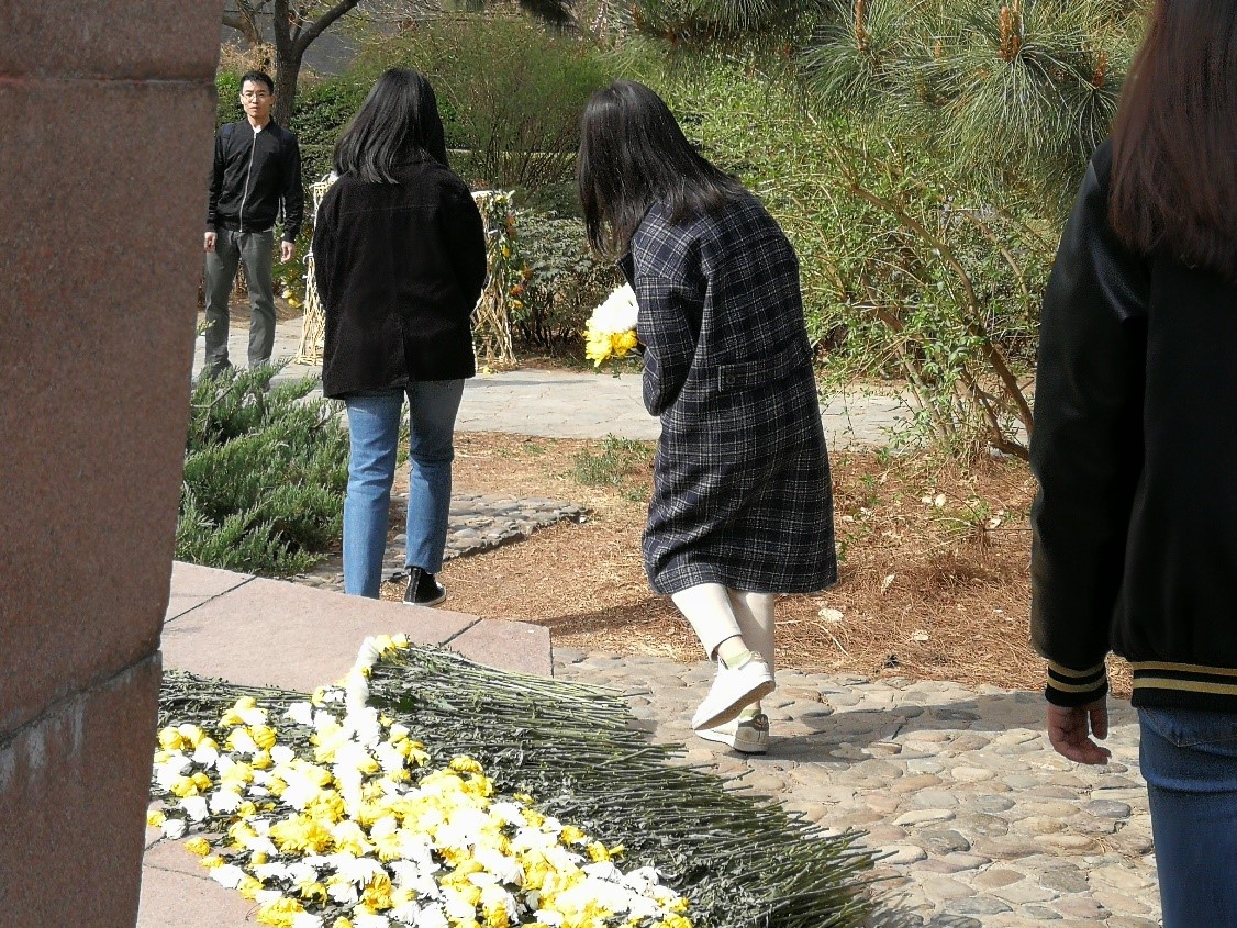 革命烈士纪念碑显得庄严肃穆。同学们手持鲜花肃立在烈士纪念碑前,向自五四运动以来直至抗美援朝战争中牺牲的83位北大师生致敬默哀,缅怀他们为国家独立和民族解放的丰功伟绩。