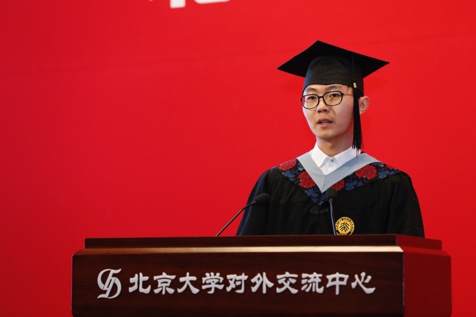 2015级本科生张思源同学作为本科毕业生代表发言。张思源在发言中分享了自己求学经历中的所见、所闻和所学。从入学时的青涩模样成长为一个富有荣誉感和使命感的少年,北大是每个北大学子的第二个家,这个既温馨有严肃,既能获得知识,又能参与不同的社团,体会大学生活百态,他列举了自己的导师盖老师的事例,老师们亲切和蔼的待人品行和严谨的学术作风世人受益良多;在学习的同时,有可以参与各种各样的课外活动,丰富了我们的生活。最后,他向母校与学院表达了自己诚挚的感谢与深切的热爱之情。