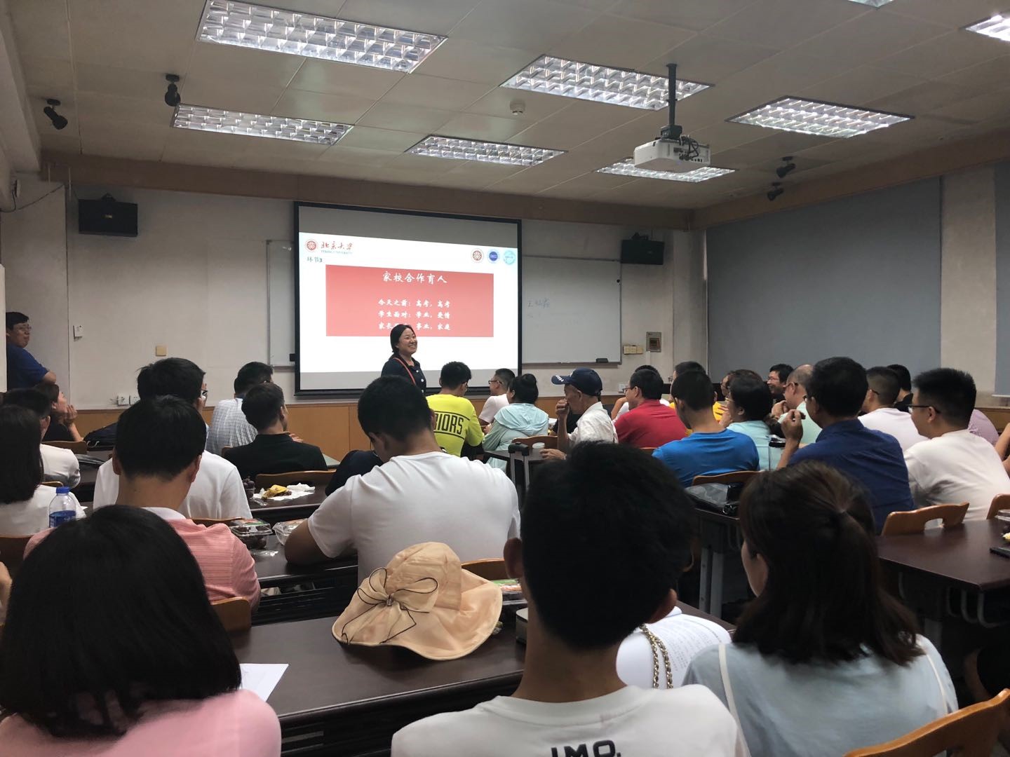 王一涵副书记介绍了学院的学生工作体系。她着重讲解了中学和大学环境的不同,希望家长们能够陪伴孩子成长、帮助孩子完成适应过程、接受孩子的全部、鼓励孩子自立。此外,王一涵副书记还详细介绍了2019级本科生分班信息以及新生班主任、辅导员的选拔和任用情况。