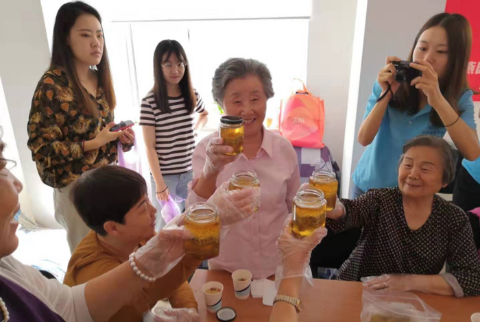 老人们戴上一次性手套,认真聆听志愿者的讲解,用双手专注地把蜂蜜倒进玻璃罐中,撒上一层桂花,再到上一层蜂蜜,耐心地重复多次,套上塑料,拧紧盖子,一瓶“蜂蜜桂花酿”就大功告成了。老人们满心欢喜的向志愿者展示自己劳动的成果,开心的笑脸洋溢在每一个人的脸上。