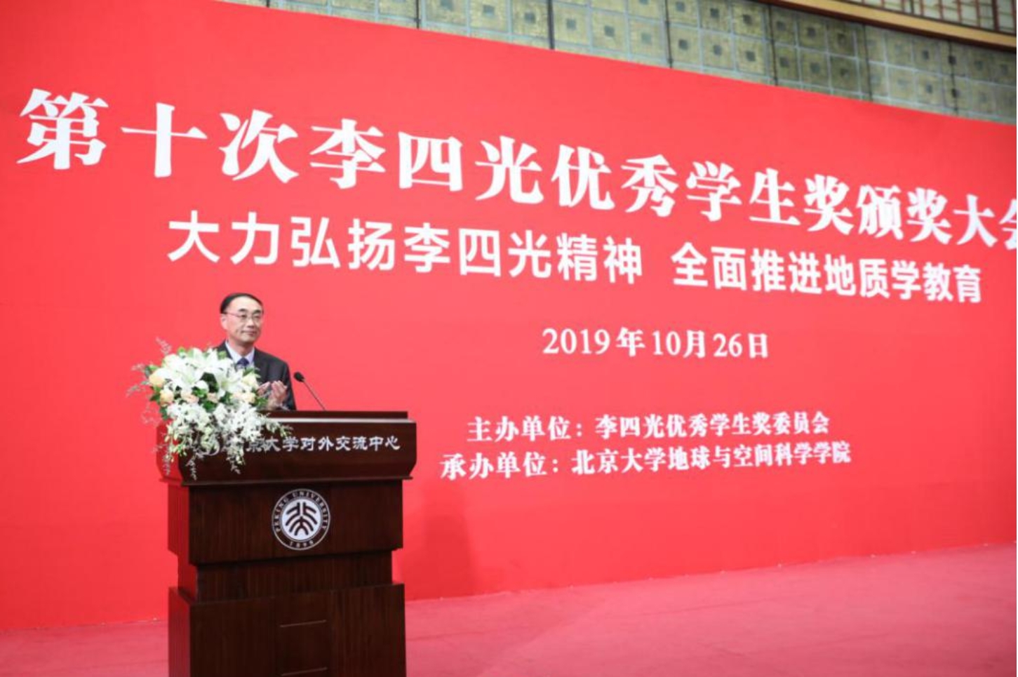 致欢迎辞。他向长期关心和支持北大地学发展的各位领导、老师表示热烈欢迎和衷心感谢,向获得第十次李四光优秀学生奖的同学们表示最热烈的祝贺。他指出,在李四光先生诞辰130周年纪念日举行第十次李四光优秀学生奖颁奖仪式,就是为了缅怀李四光先生矢志不渝的爱国精神、强烈执着的创新意识、求真务实的科学品格、鞠躬尽瘁的奉献精神。李四光优秀学生奖,已经走过十年历程,共为全国27所高校和研究所的173名同学颁发了“李四光优秀学生奖”的奖章、证书和奖金。通过对获奖学生成长的关注,这批获奖同学已经在地质科技领域成为中坚力量,学术成果在国内外学术界产生了一定的影响。希望今后该奖项在培养青年学子全面成长成才和引领地质科技发展等方面发挥重要作用;同时也希望木瓜视频