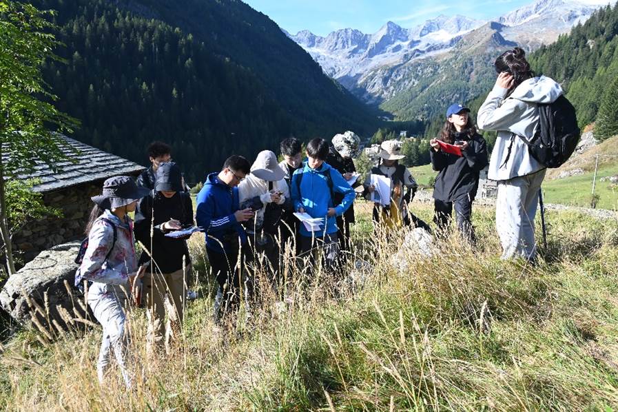 和煦的晨光中,Andrea教授带领大家登山山腰,遥望山峰,蔚蓝的苍穹下山耸森然,令人心生景仰。在路旁的科普站中,大家讨论起Valmalenco的构造背景。