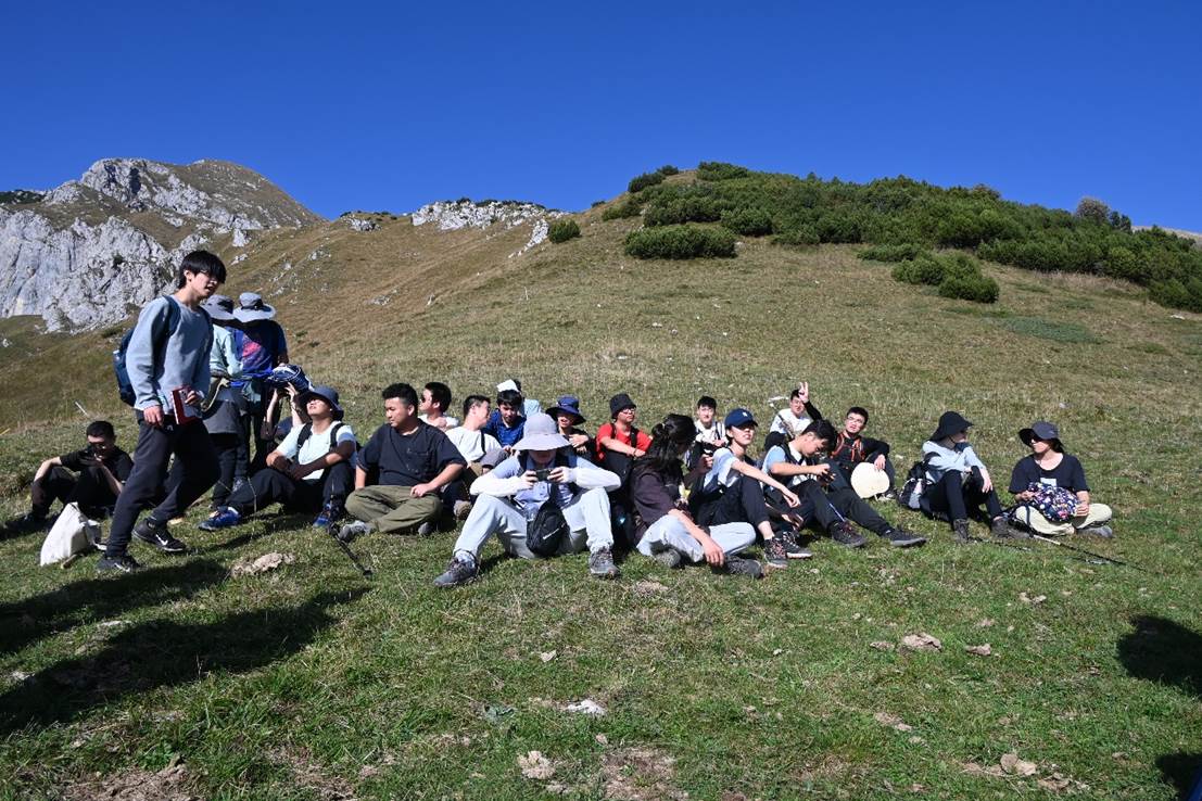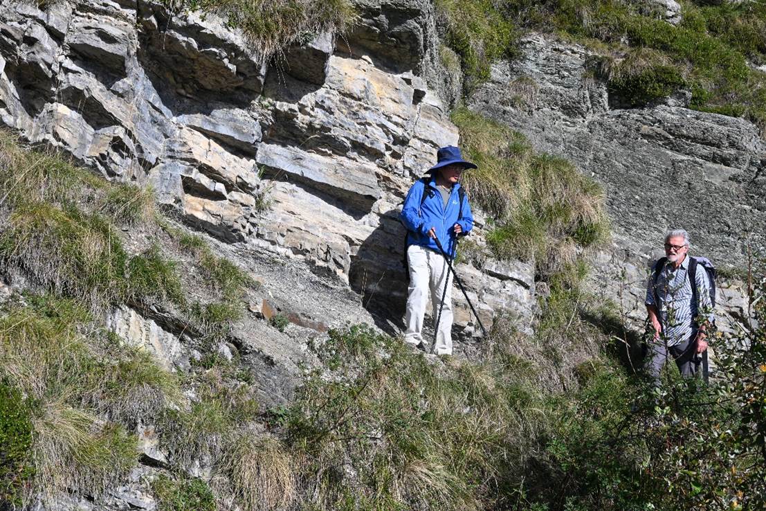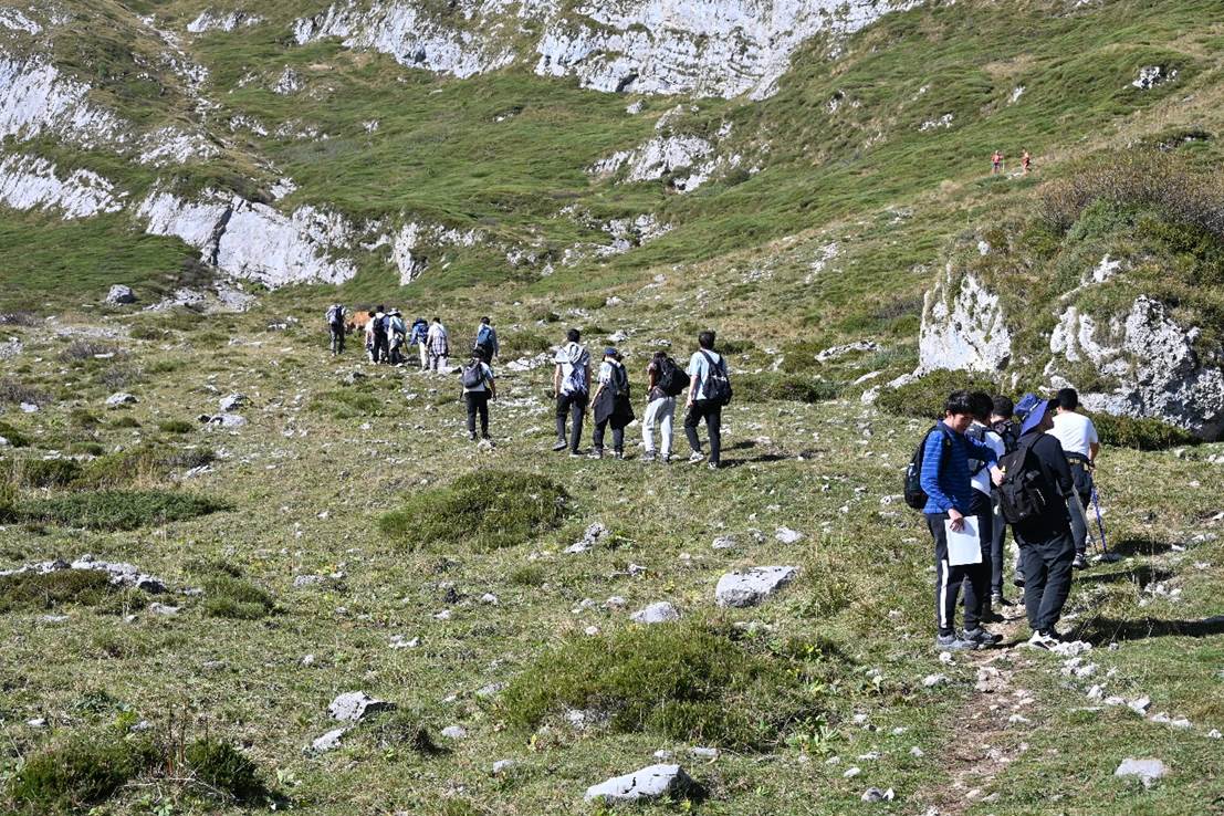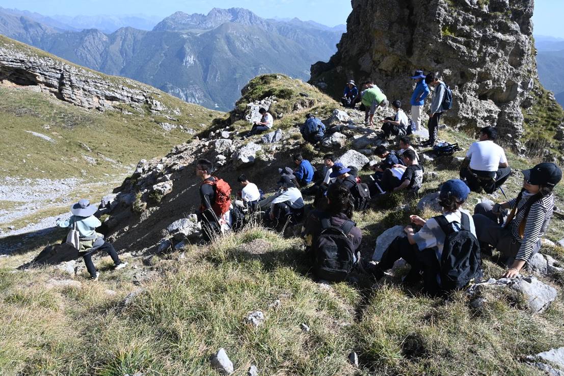 意大利当地时间2023年10月8日上午八点半,实习队在Andrea Tintori教授地带领下,继续于格里纳山(Grigna)进行攀登,系统地观察了地层发育序列和台地相-台地边缘相-盆地相的岩性变化。