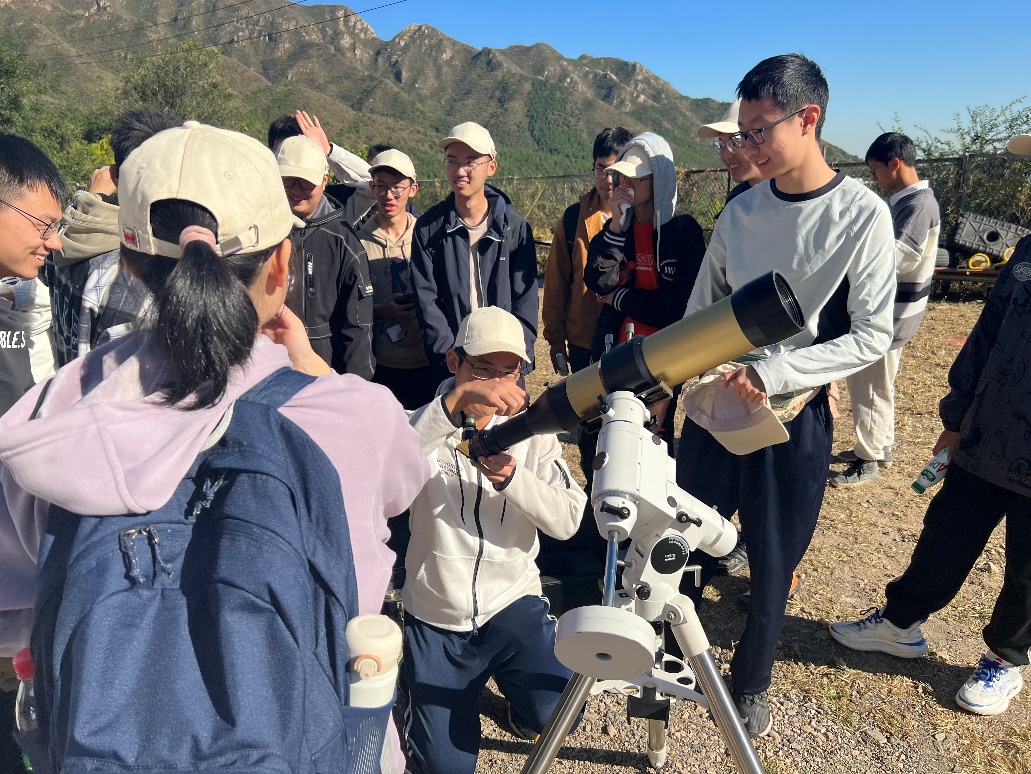 汪珊特意准备了天文望远镜,并提前给同学们下发了关于太阳简介的预习内容。有天文观测经验的丁恒宇和王亿禾同学介绍并帮助同学们调整天文望远镜。同学们轮流使用望远镜观测太阳,在老师的讲解下,同学们对太阳的结构与形态有了基本的了解与认识,用实际行动“仰望星空”。