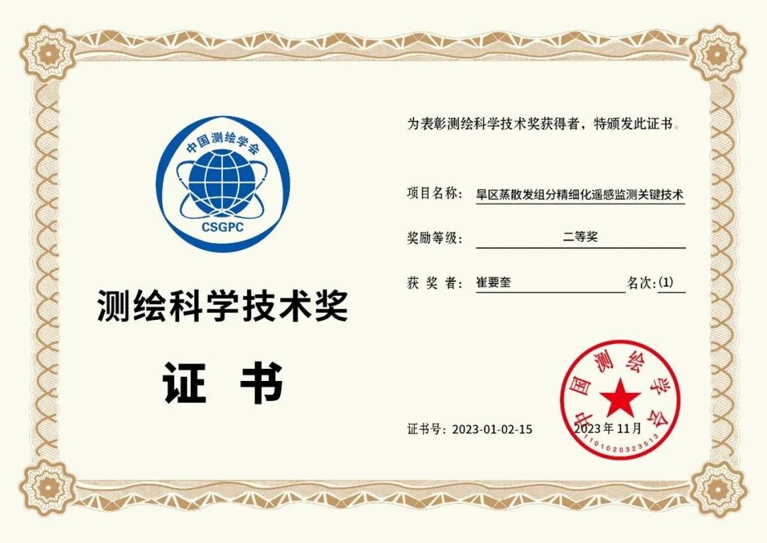 、中国农业科学院农业资源与农业区划研究所、中国科学院空天信息创新研究院、中国科学院地理科学与资源研究所、南昌工程学院等单位联合申报的《旱区蒸散发组分精细化遥感监测关键技术》项目荣获测绘科学技术奖二等奖!