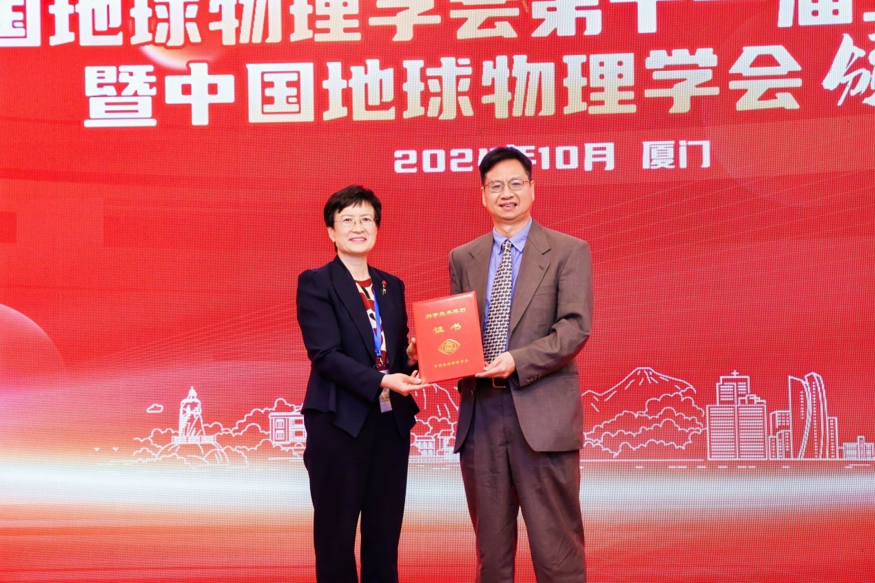 讲席教授宋晓东荣获2024年中国地球物理学会科学技术创新奖一等奖。底青云院士为获奖人宋晓东教授颁发了荣誉证书。