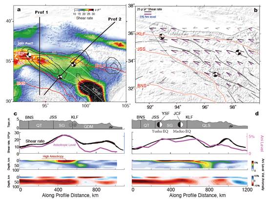 图4、上图为青藏高原东北缘的剪切形变分布和波速各向异性分布。下图为沿着两个剖面下的剪切形变下剪切形变分布和各向异性的深度分布。
