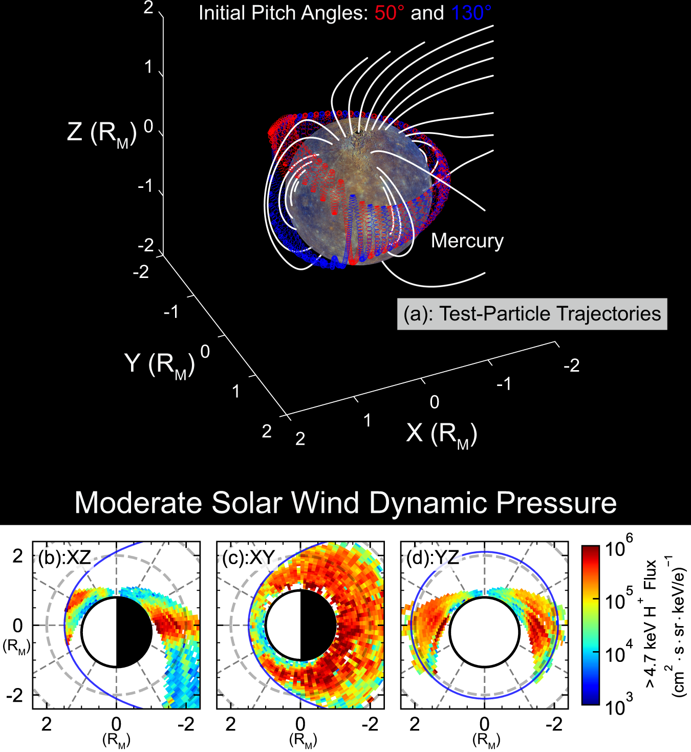 图2. 水星磁层环电流测试质子模拟轨迹(a)和观测分布图(b-d)。(a):图中蓝色和红色细线为从磁尾出发的能量为5keV、投掷角为130度/50度的测试质子的运动轨迹,白线为磁力线。(b-d):信使号观测到的能量大于4.7 keV的质子通量在日夜面、赤道面和子午面的统计分布图。图中模拟和观测都限制在了中等太阳风动压的情形下以确保统计叠加的可靠性。
