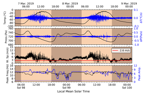 该研究采用地震学时频分析方法,对多个连续火星日内的火星表面地震背景噪声数据进行了研究,其中包括了功率谱、振幅谱、水平垂直谱比等数据的分析,并结合地震仪的工作性能噪声和气象观测数据分析了背景噪声中主要能量的变化模式和可能来源。火星地震观测数据的频谱呈现多个日周期性变化的窄条带,它们的幅值和频率的波动与风速和气温的变化具有较强一致性。火星背景噪声的水平垂直谱比值具有日周期性变化和多峰两大特征。经过以登陆器振动作为源的数值模拟,解释了这两大特征主要由登陆器自振引起。利用极性分析研究峰谷频率附近的地面运动特征,显示谱比的高频部分的地面运动主要是位于水平方向的线性运动,且方位角比较固定。这些特征与由风驱动的火星登陆器的自振模式比较吻合。谱比的低频部分存在垂直方向强于水平方向的地面运动 (2.4 Hz mode),目前针对该信号的起源存在争议,该研究使用随机减量方法对该信号进行了衰减分析,确认来自高频范围的登陆器自振引起的机械振动拥有较低的衰减系数,而2.4 Hz mode的衰减系数明显更高,这一结果为该信号的自然源假说提供了可能的依据。对于部分已经探测到的火星震事件的谱比分析显示,没有发现明显的地下结构的自然响应。