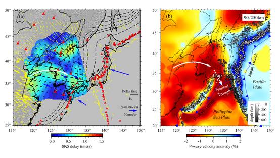各向异性的结果展示出明显的分层特征。在上地幔顶部(100km以上),S波各向异性方向主要与日本海沟垂直,且与板块运动方向相似,表明上层地幔流动主要与太平洋俯冲板片的后撤及日本海的扩张相关。更深部,各向异性出现明显的方向偏转,从西向东呈现顺时针的转向,并最终会聚于日本西南部的Nankai海沟。基于本研究模型预测的横波分裂观测结果与观测得到的结果有很强的一致性(图2a),佐证了各向异性结果的可靠性。深部各向异性方向及横波分裂结果均表明,欧亚板块下方存在部分软流圈物质由西向东经历了顺时针的偏转,并通过Nankai海沟下方的板片“窗口”进入菲律宾海板块下方(图2b)。