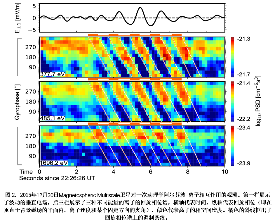 在太空物理研究中,一种被称作动理学阿尔芬波(kinetic Alfven waves)的波受到了极大的关注。这一波动可以视为宏观流体尺度(>107千米)的阿尔芬波向微观离子尺度(~101千米)的拓展。动理学阿尔芬波最为突出的特点是其频率接近离子回旋频率,且垂直波长接近离子回旋半径。这些特性使得它能够有效地参与各种微观离子尺度的动力学过程,因而在宇宙等离子体加速和加热中起到显著的作用。例如,动理学阿尔芬波可以将大量能量输送到极区电离层。这些能量一方面可以加速沉降电子,从而导致极光。另一方面,这些能量还可以加热和加速电离层中的离子和电子,引发电离层出流和大气逃逸。动理学阿尔芬波广泛存在于地球磁层中,并被认为可以显著加速磁层能量粒子并引发地磁活动,对在轨航天器的安全构成威胁。