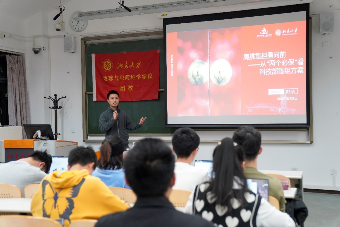 博士生讲师团黄月天同学带来主题为“肩挑重担勇向前——从‘两个必保’看科技部重组方案” 的宣讲,以独特的视角向同学们展示了科技部重组的必要性。他通过习近平总书记参加江苏代表团审议过程中所说的“两个必保”(即粮食饭碗中国必须端牢与制造业必须筑牢)为切入点结合我国各时期经济建设发展,论述了科学技术对国家现代化进程的重要性。黄月天同学还向同学们展示了科技部重组方案的草蛇灰线,串联起与科技部重组有关的各大重要会议,形成了清晰的改革发展路线,帮助同学们更好地了解重组方案的来龙去脉。在最后,他结合北大自身科研创新特点,希望同学们成为国家科技发展路上的主力军,为中国式现代化贡献更多北大智慧、北大力量、北大方案。