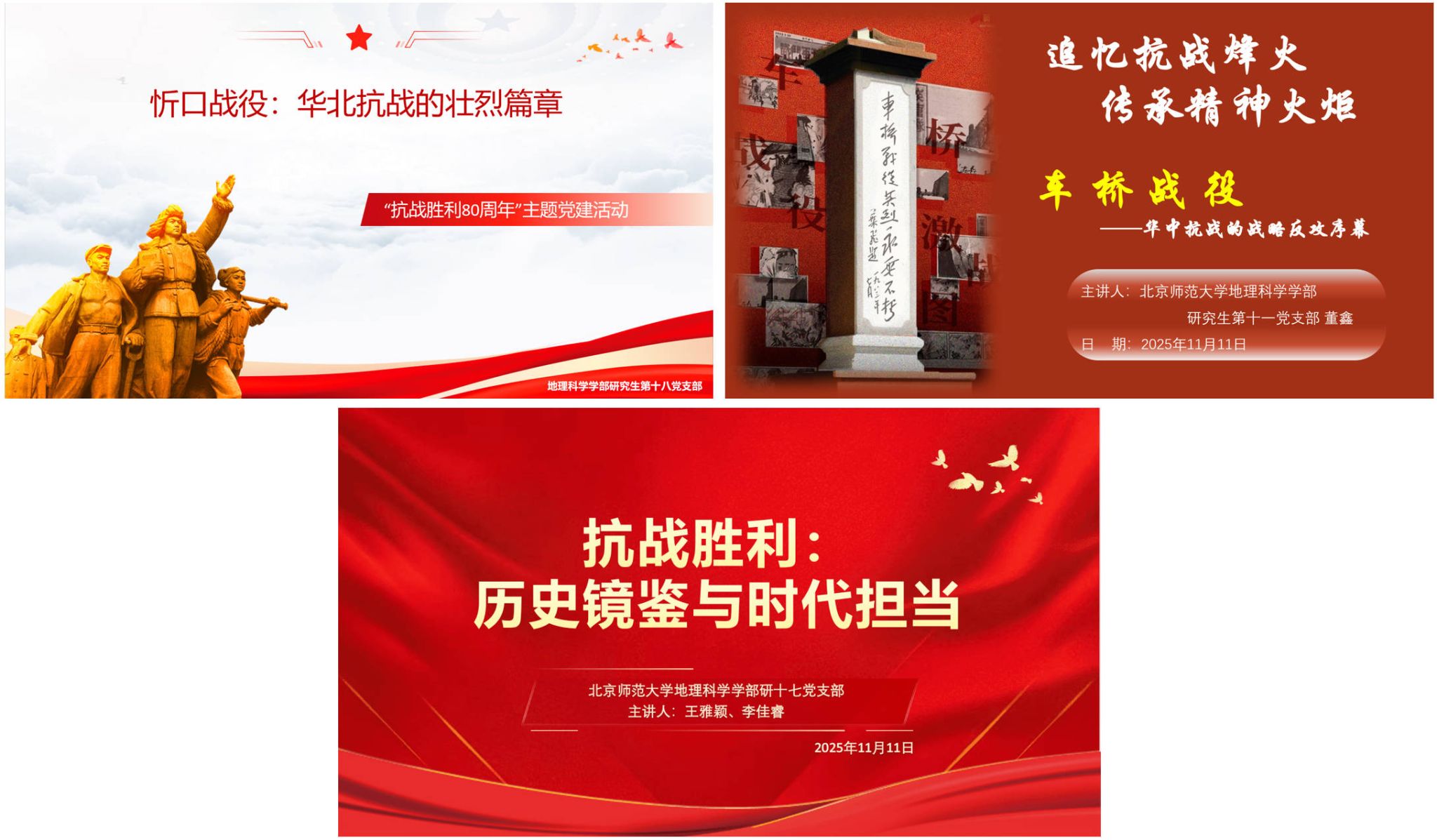 遥感博士生党支部联合遥感硕士生党支部、清华大学车辆与运载学院车辆博22、博21、硕23、博5党支部以及北京师范大学地理科学学部第十一、十七、十八党支部,开展了“追忆抗战烽火,传承精神火炬”主题联学联讲活动。