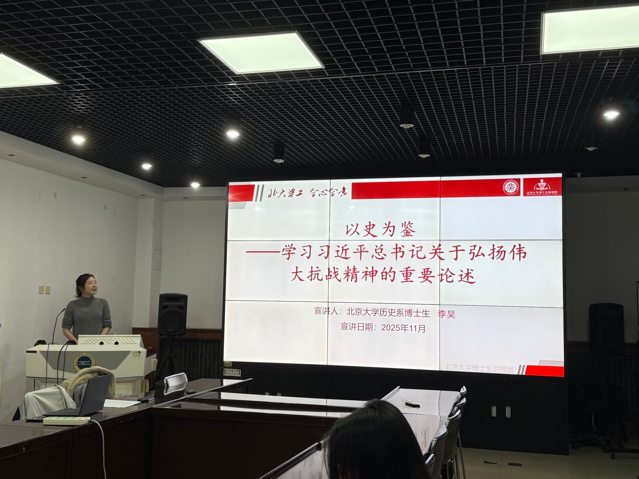 博士生讲师团讲师李昊同志以“以史为鉴:学习习近平总书记关于弘扬伟大抗战精神的重要论述”为题作宣讲。她从“八年抗战”到“十四年抗战”的叙述演变切入,系统梳理了话语转换背后的国家立场与历史学理,号召青年党员把伟大抗战精神中的“爱国情怀、民族气节、英雄气概、必胜信念”转化为坚定的历史自信与实践担当,在强国建设、民族复兴的征程上勇毅前行、实干笃行。