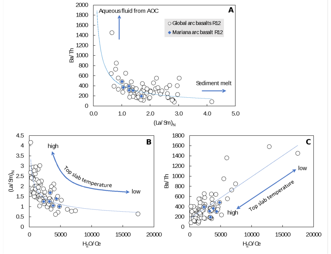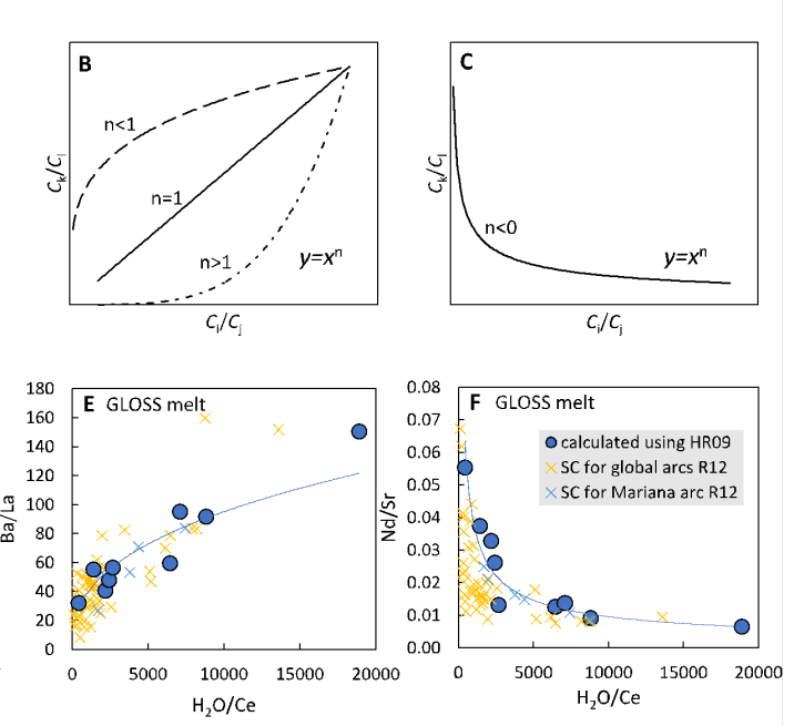 图1 三元混合模型中,Ba/Th和(La/Sm)N分别代表了蚀变洋壳释放的富水溶液和沉积物熔体端元(A)。而他们与H2O/Ce的相关性可以用幂函数来拟合,代表了板片熔体中由于温度变化而发生的元素分异(B,C)。