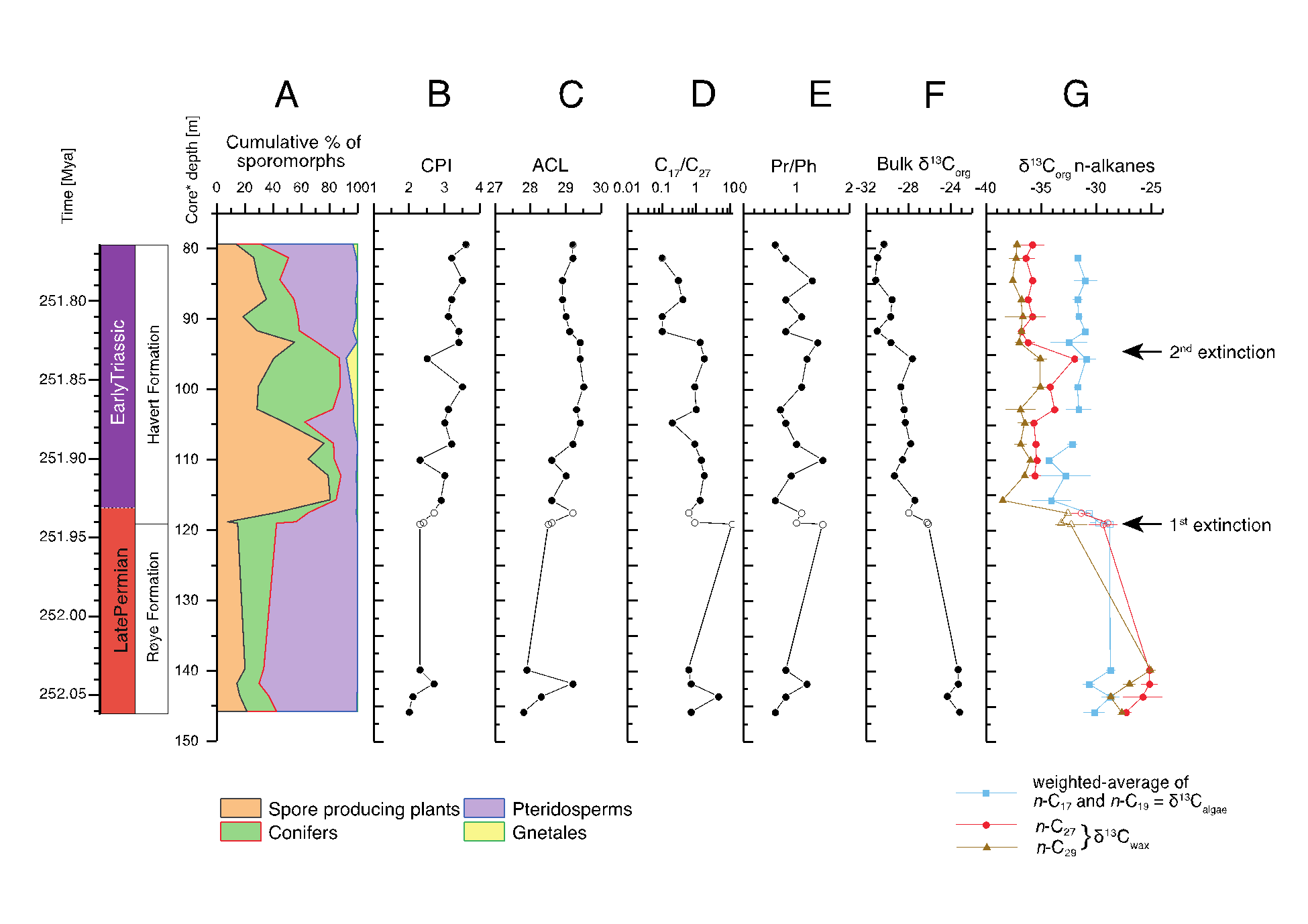 研究团队对来自挪威Finnmark台地的两个保存完好的沉积岩钻孔进行了大量有机地球化学分析,其中包括短链及长链正构烷烃的分子丰度、分子有机碳同位素、全岩碳同位素、植烷/姥鲛烷比值以及植物孢粉丰度的测量。在有机地球化学分析中,短链及长链正构烷烃的丰度变化分别代表了海洋藻类或细菌及利用C3光合作用的陆生高等植物的丰度变化。
