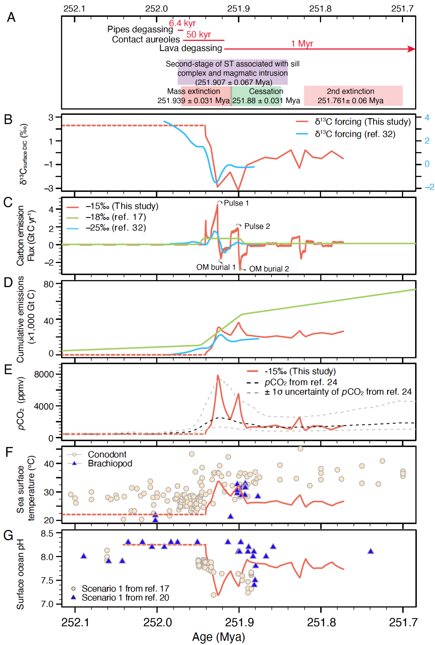 通过与古海水温度和pH代用指标数据的对比,研究团队得出西伯利亚大火成岩省喷发时释放的大量CO2导致了高达15摄氏度的全球变暖以及1个单位的pH值降低,从而导致了90%的海洋物种及70%的陆地物种灭绝。