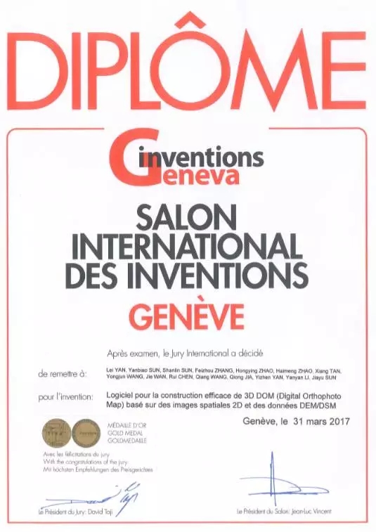 第45届日内瓦国际发明展于2017年3月29日至4月2日在瑞士的日内瓦Palexpo会展中心正式举办。由晏磊教授团队和桂林航天工业学院的孙山林教授团队共同参展的《基于航空航天极坐标摄影测量APCP(Aerospace Polar-Coordinate Photogrammetry)理论的新一代遥感软件与无人机成像系统》荣获此次日内瓦国际发明展的评审团特别嘉许金奖(Gold Medal with the congratulations of the jury),评审团特别嘉许金奖为最高级别金奖,由评审团一致认可授予。
