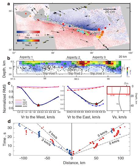 地球物理专业研究人员结合了多种观测数据反演了玛多地震的破裂过程。反演结果显示该地震为双侧破裂。而向东的破裂速度为超剪切(破裂速度超过剪切波波速),向西的破裂速度为亚剪切。该研究同时分析了形成这种双侧双速破裂的原因可能与两侧破裂的集中深度有关。西侧破裂较浅,导致浅部速度强化深度在整个破裂深度占比较高,因此维持破裂传播将消耗较高的应变能,导致破裂速度较低。而东侧破裂较深,浅部强化区消耗的应变能占比低,有更多的应变能形成超剪切破裂。(图3)