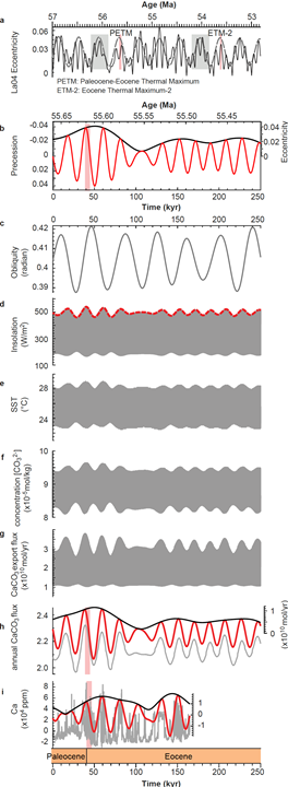 其次,地球系统瞬变模拟实验重现了沉积物中钙含量数据的天文周期信号,模拟结果与实际沉积记录可以对比,为研究深时气候变化的天文驱动研究提供了思路。