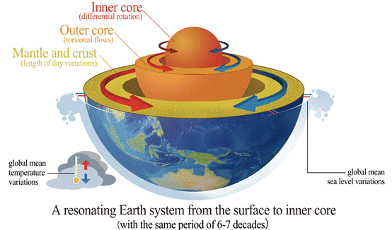 Fig 2. A possible resonating Earth system from the surface to the inner core. The system includes the inner core (from its differential rotation), the outer core (from the magnetic field changes), mantle and crust (from the LOD variations), and the surface (from the global mean sea level rise and temperature).