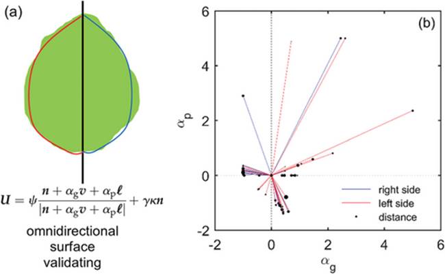 第一个方面结构支撑的验证,是通过对不同树种的树冠是否具有复眼特征的全向表面而进行案例测试,测试的具体方法是重新分析根据树木生长的前向传播模型而衍生的树冠侧向轮廓特征,如下图a所示。统计结果表明,模型参数值分布在其可能呈现的所有四个象限,如下图b所示,这证明可以从不同树种的树冠中检测出全向表面。这一发现可为确保所提出复眼模型的结构支撑前提奠定了基石。