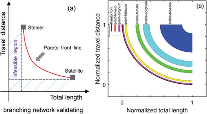 第二个方面视觉路径的验证,是案例测试植物的分枝是否是传递其视觉信息和做出视觉反应的最佳方式。测试以常用的与Pareto front的距离为判断依据,如下图a所示,统计发现大量样本植物的分枝结构遵循靠近Pareto front线,如下图b所示,这可使得分枝总长度和养分运输距离最优化,对视觉信息传输和处理也同样有效,由此从植物视觉行为的角度对这一方面进行了初步验证,这可为确保所提出复眼模型的视觉路径前提打下基础。
