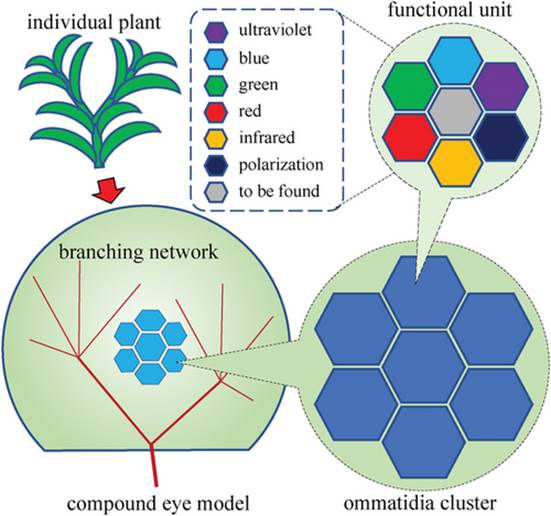 由此设计的植物视觉功能-结构复眼模型如下图所示,这种理论模型可以从功能上支持关于植物呈现模仿功能的视觉基础及其解释机制的科学假设。具体来讲,植物整体的视觉可表示为一个用于模拟其视觉感应端的复眼,以及一个用于模拟其视觉反应的分层分支网络。复眼由不同尺度的“小眼”(ommatidium)簇组成,与不同大小的茎、枝和叶的集合体对应。此外,每个“小眼”可以拥有多个功能单元,它们可以分别感知从紫外、蓝、绿、红到红外和偏振等的光学特性,具体还可随后续新发现的视觉功能而扩充。
