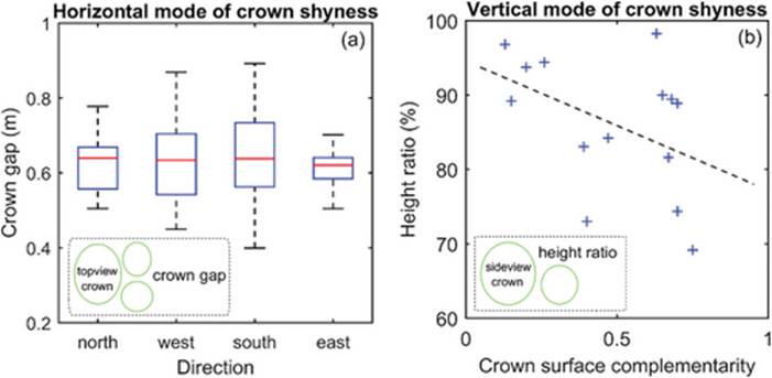 在功能前提得到保证后,可以从植物行为特征整体效果的角度进一步验证所提出的理论模型。这种效果可以在树冠羞避(crown shyness)的现象中体现出来。案例统计显示,不同方向的顶视树冠间隙呈现了树冠羞避多样但存在的水平模式,如下图a所示;侧视冠顶高度比和冠面互补性也呈现了树冠羞避多样但存在的垂直模式,如下图 b所示。这两种解码呈现的模式原理上可以用所提出的复眼模型来解释,反过来也可以证明其有效性。