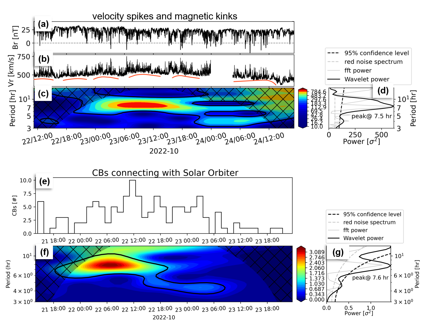 图6. 准周期出现的太阳风速度脉冲与日冕增亮事件. (a) 太阳风中磁场径向分量;(b) 太阳风径向速度;(c) 太阳风径向速度的二维小波变换功率谱,黑色线标记的区域内置信度为95%;(d) 功率谱的时间平均(黑色实线),峰值周期为7.5小时;(e) 时空回溯定时定位得到的日冕增亮事件数目的时间序列;(f) 日冕增亮事件数目的时间序列的二维小波变换功率谱,黑色线标记的区域内置信度为95%;(g) 功率谱的时间平均(黑色实线),峰值周期为7.6小时。