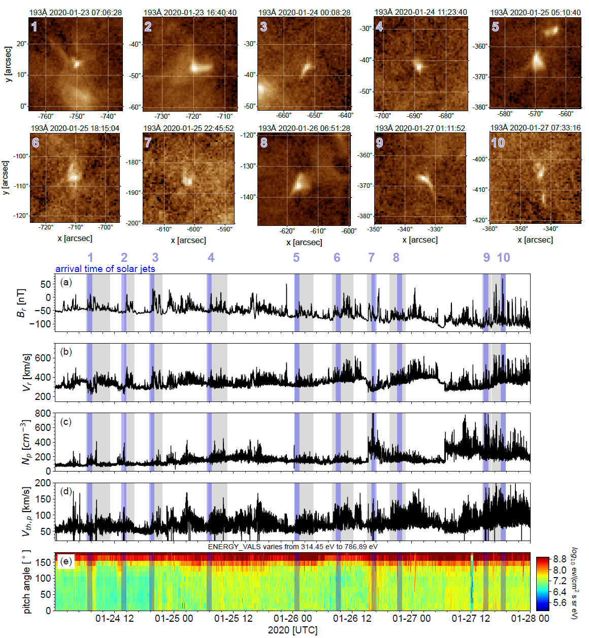 图3. 太阳大气喷流活动与太阳风速度脉冲/磁场急转的对应关系. 顶部10个子图(1-10)表示AIA 193 Å观测到的十次喷流事件;(a) 太阳风中磁场径向分量;(b) 太阳风径向速度;(c) 太阳风质子数密度;(d) 太阳风质子热速度;(e) 能量范围为314 eV至786 eV的电子投掷角分布。子图(a)-(d)中的灰色阴影区域标记了速度脉冲/磁场急转簇。蓝色阴影区标记了计算得到的喷流扰动到达PSP的时间,到达时间有1小时的不确定度。