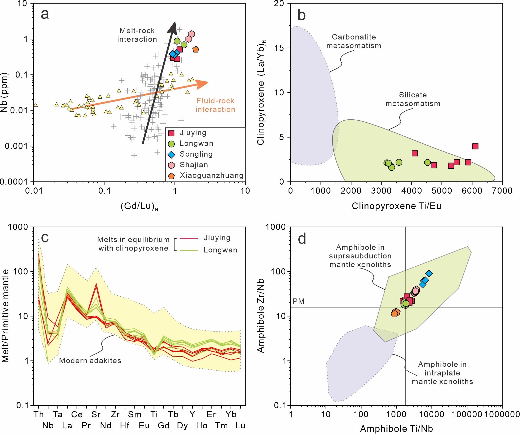图1. (a)全岩Nb vs (Gd/Lu)N图解;(b)单斜辉石(La/Yb)N vs Ti/Eu图解;(c) 与单斜辉石平衡的熔体微量元素蛛网图;(d)角闪石Zr/Nb vs Ti/Nb图解.