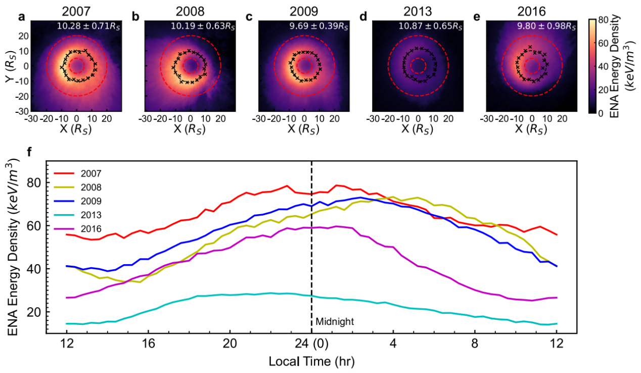 木瓜视频 空间物理与应用技术研究所乐超研究员课题组利用土星探测卫星卡西尼号(Cassini)上搭载的能量中性原子成像仪研究了土星环电流的长期分布特征,发现由超热等离子体(~24-230 keV)贡献的环电流成分在空间分布和强度上存在近11年的长周期变化,并将这种变化与太阳活动周期相关联,提出太阳活动周期调制土星磁层中等离子体加速与输运过程的可能性。相关成果于近期发表于学术期刊《自然·通讯》(Nature Communications)。